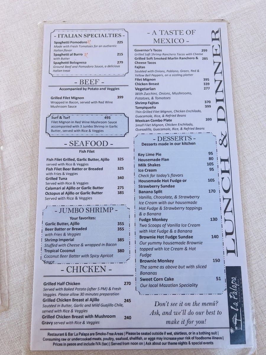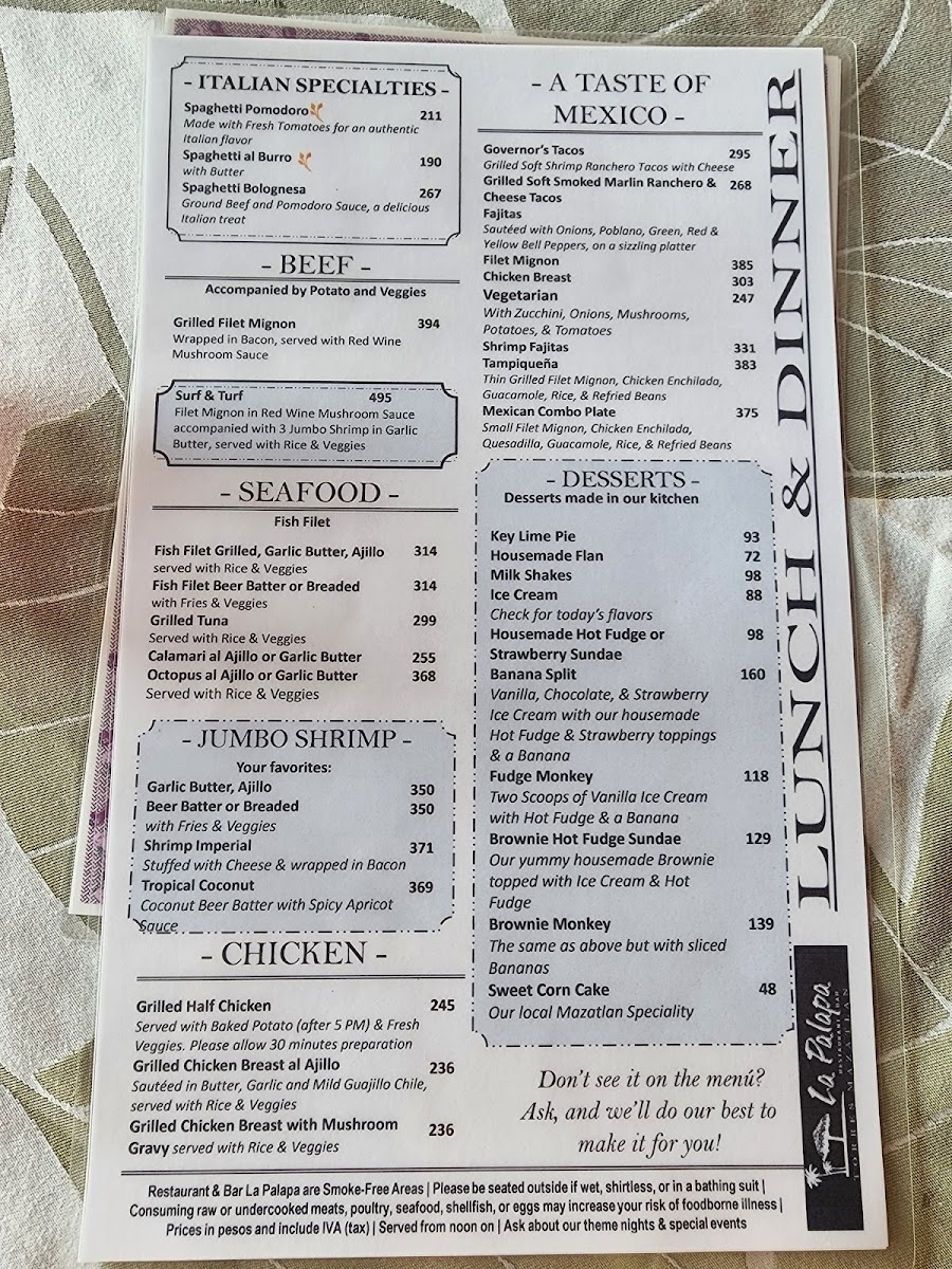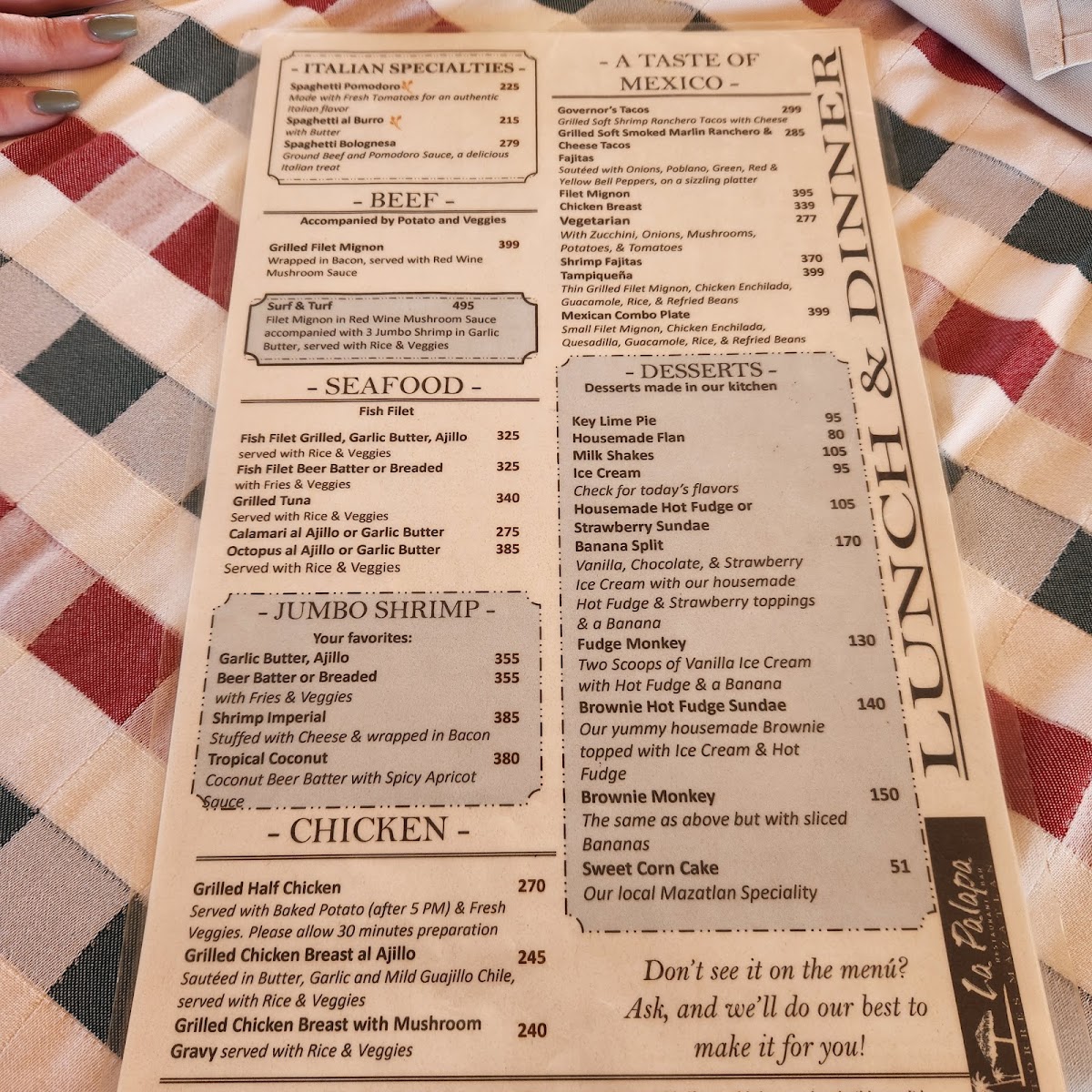 Welcome to La Palapa Restaurant, nestled in the picturesque Torres Mazatlan. This oceanfront gem captivates diners with an extensive menu that blends traditional flavors with modern culinary twists. Under the soothing shade of a palapa, guests can savor items like melt-in-your-mouth rib eye steaks, praised even by those who are not typical meat eaters.
